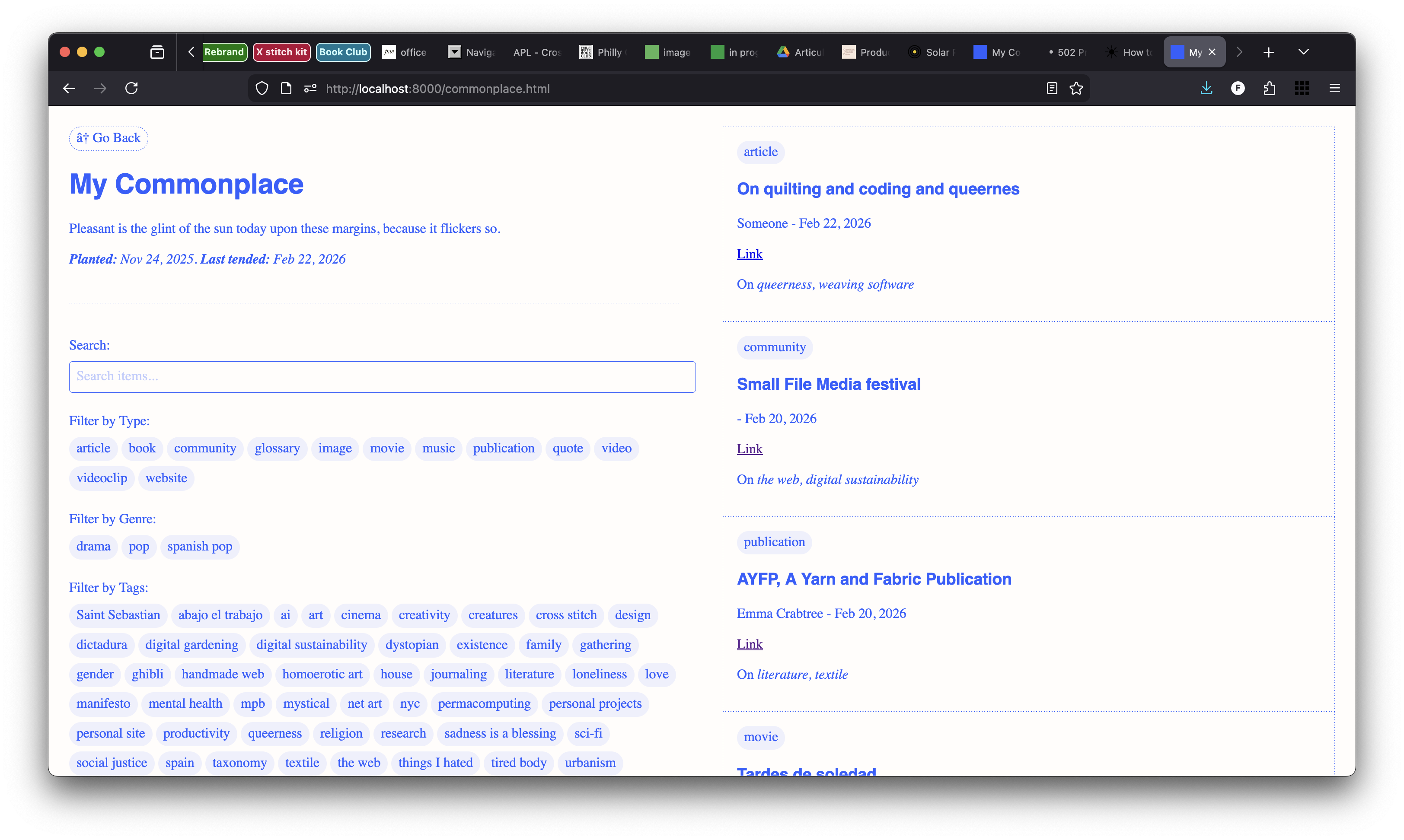 I haven't made any tweaks to the commonplace today. I just took a glimpse at the code and the site to rejoice for a minute at how it's coming together. The tag and type filters are there. Now, all that remains is to fill in the json databases for all the items I have documented in the past. My last resolution as to how to structure these databases has changed quite abruptely: for some weeks I was determined to use only one json called Collected, after trying it and feeling it was chaotic and too many objects of too many different natures were colliding in one file, I opted for separating them in the jsons mentioned in the previous entry. Part of the lesson of this project is that there's no perfect taxonomy, all that is needed is to start with something even if it doesn't feel perfectly organized. The joy of taxonomy might be something close to this discomfort, to be always improving the categories, the lists, the boxes one works with.