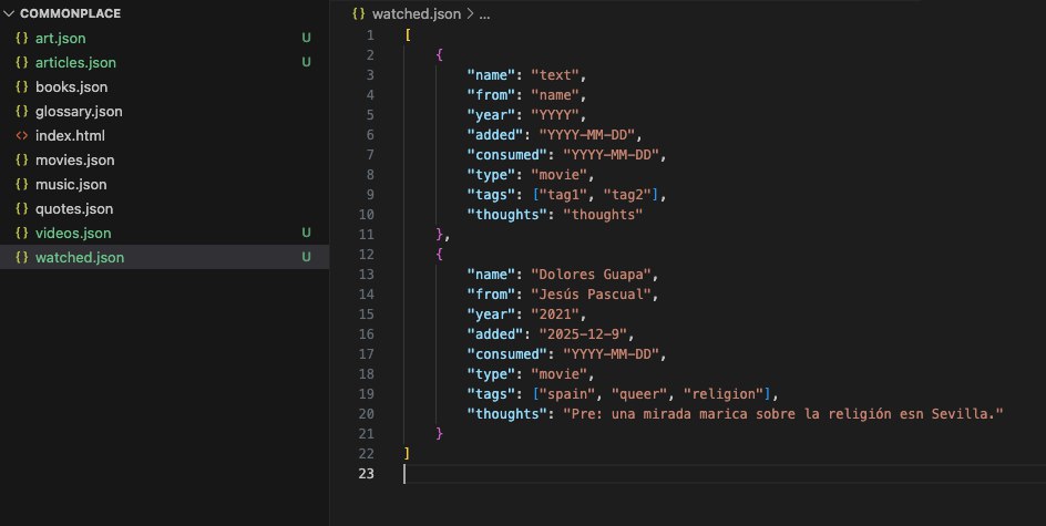 Found this image from Sep 12 2025 of this commonplace very early jsons "architecture". I remember at that point struggling with the idea of having one json for each type of entry. Crazy.