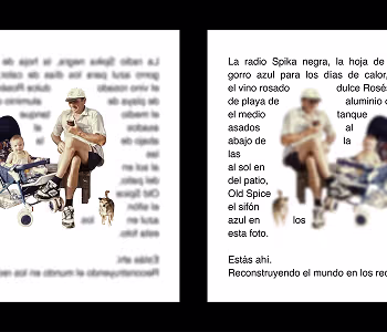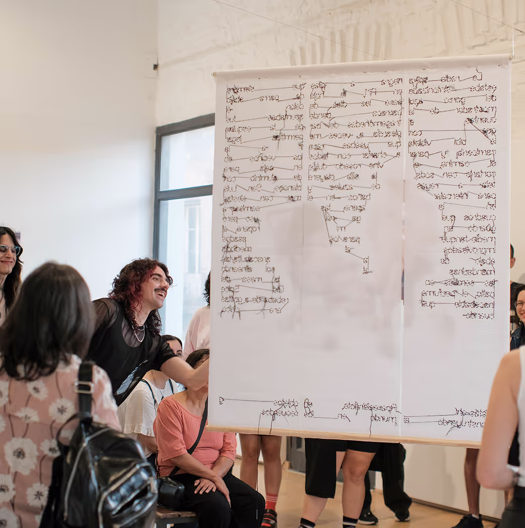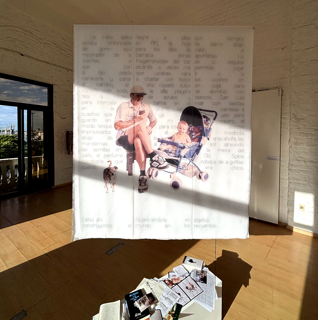 My first goal was to be able to finish this by the end of 2024, so I'd be able to present it at Nuevo Reino's 2024 Portal (the group exhibition from the annual collective I attend). One reality check later: I didn't have the time to do so. But after a quick meltdown I realized presenting this as a WIP was also powerful. After all, this is really a memory in reconstruction, so showing a glimpse into the process was also faithful to this work. For this, I had already embroidered the text on one side, but the embroidered photography was missing on the other. So I used a printed translucent fabric with the picture to be stitched: like a building facade on restoration. Alongside this, I put some of the process material on display: sketches, notes, books, photos, patterns.
